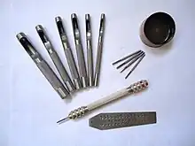 Quelques outils de joaillerie dont une pince à morilles équipée d'un taraud.