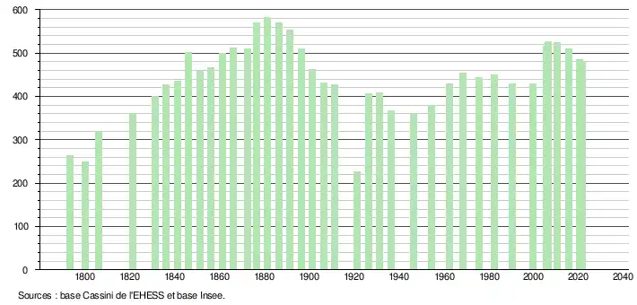 L'évolution du nombre d'habitants est connue à travers les recensements de la population effectués dans la commune depuis 1793. Pour les communes de moins de 10 000 habitants, une enquête de recensement portant sur toute la population est réalisée tous les cinq ans, les populations légales des années intermédiaires étant quant à elles estimées par interpolation ou extrapolation[31]. Pour la commune, le premier recensement exhaustif entrant dans le cadre du nouveau dispositif a été réalisé en 2005[32].