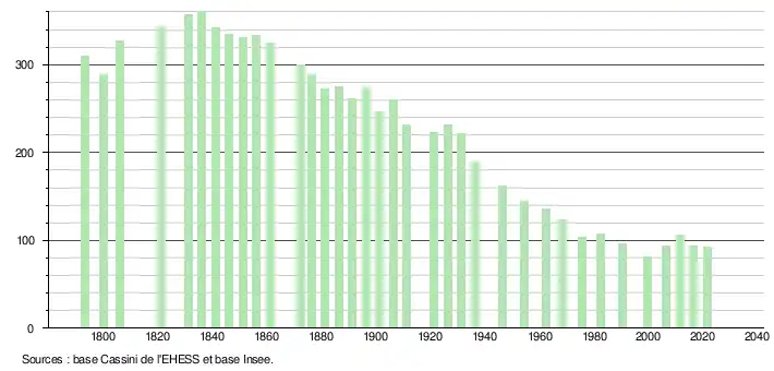 L'évolution du nombre d'habitants est connue à travers les recensements de la population effectués dans la commune depuis 1793. Pour les communes de moins de 10 000 habitants, une enquête de recensement portant sur toute la population est réalisée tous les cinq ans, les populations légales des années intermédiaires étant quant à elles estimées par interpolation ou extrapolation[23]. Pour la commune, le premier recensement exhaustif entrant dans le cadre du nouveau dispositif a été réalisé en 2006[24].