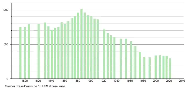 L'évolution du nombre d'habitants est connue à travers les recensements de la population effectués dans la commune depuis 1793. Pour les communes de moins de 10 000 habitants, une enquête de recensement portant sur toute la population est réalisée tous les cinq ans, les populations légales des années intermédiaires étant quant à elles estimées par interpolation ou extrapolation[19]. Pour la commune, le premier recensement exhaustif entrant dans le cadre du nouveau dispositif a été réalisé en 2006[20].