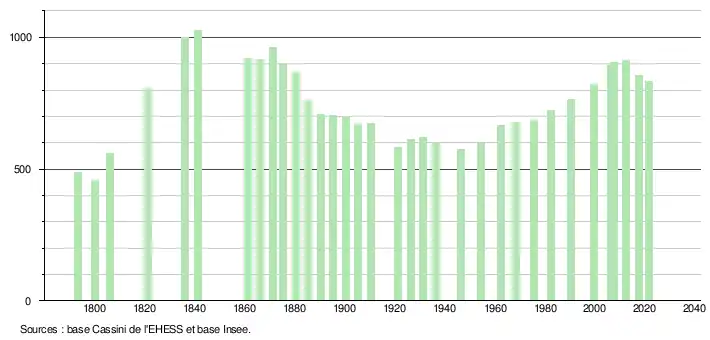 L'évolution du nombre d'habitants est connue à travers les recensements de la population effectués dans la commune depuis 1793. Pour les communes de moins de 10 000 habitants, une enquête de recensement portant sur toute la population est réalisée tous les cinq ans, les populations légales des années intermédiaires étant quant à elles estimées par interpolation ou extrapolation[19]. Pour la commune, le premier recensement exhaustif entrant dans le cadre du nouveau dispositif a été réalisé en 2007[20].