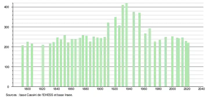 L'évolution du nombre d'habitants est connue à travers les recensements de la population effectués dans la commune depuis 1793. Pour les communes de moins de 10 000 habitants, une enquête de recensement portant sur toute la population est réalisée tous les cinq ans, les populations légales des années intermédiaires étant quant à elles estimées par interpolation ou extrapolation[25]. Pour la commune, le premier recensement exhaustif entrant dans le cadre du nouveau dispositif a été réalisé en 2008[26].