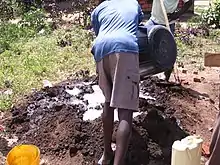 Dans la campagne quand la terre s'extrayait tout près de la construction, il arrivait quelquefois qu'après en avoir pioché un peu, le garçon la transformait en mortier sur le tas même. Ayant porté ce mortier au maçon, il piochait une nouvelle quantité de terre qu'il transformait en mortier et il continuait ainsi de suite, quelquefois jusqu'à des profondeurs assez considérables[8].
