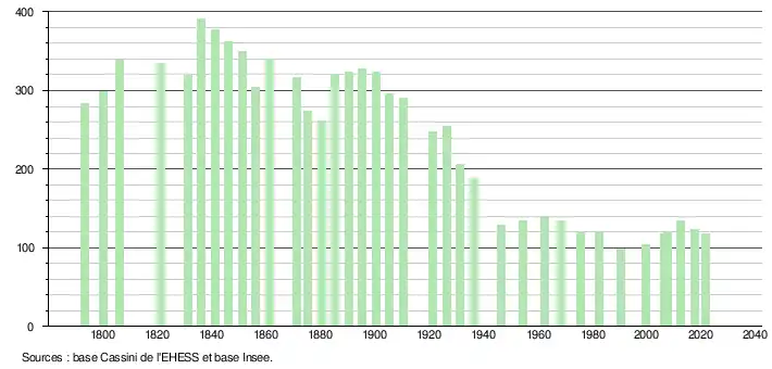 L'évolution du nombre d'habitants est connue à travers les recensements de la population effectués dans la commune depuis 1793. Pour les communes de moins de 10 000 habitants, une enquête de recensement portant sur toute la population est réalisée tous les cinq ans, les populations légales des années intermédiaires étant quant à elles estimées par interpolation ou extrapolation[16]. Pour la commune, le premier recensement exhaustif entrant dans le cadre du nouveau dispositif a été réalisé en 2007[17].