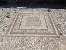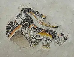 La maison du Trident contient des panneaux de péristyle avec un motif de dauphin noir situé autour d'une ancre rouge et de tridents noirs sur fond blanc. Le thème suggère que les propriétaires de la maison étaient liés à des activités maritimes[60]. Ces mosaïques bidimensionnelles simples contrastent avec les mosaïques hellénistiques tridimensionnelles multicolores, finement détaillées de figures et de motifs[56]. Elles sont peut-être comparables ou même liées aux mosaïques de sol en noir et blanc qui apparaissent dans l'Italie romaine quelques décennies plus tard[56].