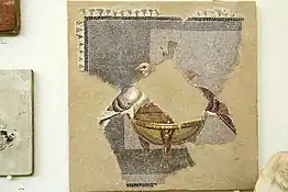 À droite : mosaïque de Délos avec des pigeons affluant autour d'une coupe. Musée archéologique de Délos.