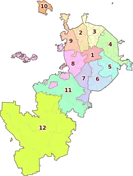 Moscou s'est développé en occupant des cercles concentriques de diamètre croissant. Contrairement à Paris la ville a incorporé ses banlieues et occupe une superficie de 1 100 km2 (en excluant les villes satellites peu denses situées à l'extérieur de la rocade routière MKAD mais rattachées à la ville qui représentent une population de 300 000 habitats sur 1 420 km2). On peut comparer cette superficie aux 814 km2 de la Métropole du Grand Paris. Avec douze millions habitants dans cette partie de la ville (2017), la densité est de 10 900 hab./km2 supérieure à celle de la petite couronne parisienne (9 000 hab./km2) malgré la présence importante de forêts et de parcs[7].