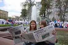 Femmes lisant le journal Moskovskaïa Pravda en 2014 à Moscou