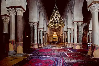 Fondée vers 670, la Grande Mosquée de Kairouan (en Tunisie) est l'un des plus anciens et le plus prestigieux sanctuaire de l'Occident musulman[24]. Par son plan et ses caractéristiques architecturales, la Grande Mosquée de Kairouan servit de modèle à de nombreuses mosquées dans divers pays du Maghreb, en Andalousie et jusqu'à l'Égypte de la période Fatimide[24].