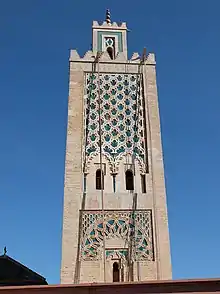 Le minaret est l'élément le plus remarquable de la mosquée et le plus richement décoré. Comme pour le style architectural mérinide en général, il dérive du style almohade. Il semble être en particulier calqué sur le minaret almohade de la mosquée de la Kasbah de Marrakech[1]. Ses façades supérieures sont recouvertes du motif darj-w-ktaf ou sebka (ressemblant à des formes de palmettes ou de fleurs de lys), avec des différences mineures entre les motifs des côtés nord et sud par rapport à ceux des côtés est et ouest. Les façades inférieures sont dominées par de grands motifs en arc polylobé. Comme pour la mosquée de la Kasbah, tous ces motifs sont moulés en brique sur un fond de carreaux de faïence vert turquoise. Contrairement aux minarets almohades, cependant, il n'y a pas de frise de zellige près du sommet du minaret. Chaque façade est percée de trois fenêtres avec des arcs en forme de fer à cheval, dont les positions sont agencées en fonction des motifs d'arc polylobé qui les entourent. Le sommet du minaret, y compris sa lanterne supérieure, est bordé de merlons typiques de l'architecture marocaine.