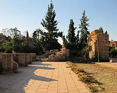 Certains historiens ont suggéré qu'un ancien bastion de la kasbah almoravide (Ksar el-Hajjar) aurait servi de minaret à la mosquée. Ses vestiges sont visibles à l'angle nord-est de la mosquée[11],[4].