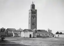 Une première mosquée fut construite en 1148 par le sultan Almohade Abdelmoumen après avoir conquis Marrakech. Il reconstruira une deuxième version de taille semblable vers 1158. Celle-ci est la version actuelle, la première ayant été démolie. Abu Yusuf Ben Tachafin finalisera la construction du minaret vers 1195[3]. La Koutoubia est considérée comme un important exemple d'architecture almohade et de l'architecture des mosquées marocaines de manière générale[3]. Le minaret de 77 mètres est décoré de différents motifs géométriques et surmonté d'une flèche et d'orbes métalliques. Il a probablement inspiré d'autres bâtiments tels que la Giralda de Séville et la tour Hassan de Rabat, qui ont été construits peu de temps après à la même époque[4],[5],[6],[7]. Le minaret est également considéré comme un repère urbain et un symbole important de Marrakech.