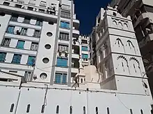 Mosquée du Bey Mohamed el-Kebir vers 1920, avant qu'elle soit submergée par de nouveaux immeubles; à droite au loin, la montagne des lions | ||