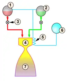 Schéma Alimentation par pressurisation des réservoirs : 1 Réservoir carburant, 2 Réservoir comburant, 3 Vannes, 4 Chambre de combustion, 5 Échangeur thermique, 6 Réservoir gaz utilisé pour la pressurisation, 7 Tuyère.