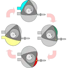 Dans certains moteurs, les soupapes étaient remplacées par des chemises mobiles dites « louvoyantes » découvrant des lumières. Ce principe a été utilisé avec succès (excellente fiabilité, très bon rendement, silence de fonctionnement[2]) sur les moteurs d'avion Bristol Hercules, qui furent également construits sous licence par la Snecma jusque dans les années 1970, pour l'équipement des avions de transport militaire Noratlas et Breguet 890 Mercure. Deux systèmes de moteurs sans soupapes ont été construits, le système Knight, avec deux manchons en mouvement en haut et bas de direction contraire pour le manchon externe et l'interne, que l'on installait sur les voitures Willys, Daimler, Panhard, Voisin, Minerva, Peugeot et d'autres, et le système à manchon unique, type Burt-McCollum, avec un mouvement simultané en haut et en bas et à droite et à gauche, un point quelconque du manchon faisait une sorte d'ellipse, qui n'avait pas les sérieux problèmes du système Knight, et aussi éliminait les régions à forte usure par faible graissage proches du PMS et PMI de la course du piston. D'après un entretien avec Mike Hewland[3], il a réussi à faire tourner au-dessus de 10 000 tr/min un monocylindre de 500 cm3 avec ce type de distribution, premièrement installée sur les voitures Argyll, puis dans les moteurs d'aviation Bristol, avec une consommation d'huile plus réduite que sur les moteurs avec soupapes traditionnelles, et une consommation spécifique de gazoline d'environ 175 g/ch par heure, le moteur fonctionnait aussi avec de la créosote. Les efforts plus intenses pour le développement du système Burt-McCollum ont été faits en Angleterre par H. Ricardo et R. Fedden. Le moteur Wankel (/[vɑ̃kɛl]/) est un moteur à piston rotatif fonctionnant selon le cycle de Beau de Rochas, dans lequel un piston « triangulaire » convertit l'énergie issue de la combustion du carburant en une énergie mécanique de rotation.
