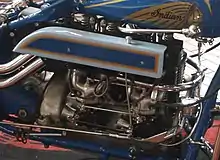 Moteur V-Twin Indian IOE (1915). Noter l'admission, assurée par un unique carburateur, en haut des cylindres et l'échappement latéral plus bas.