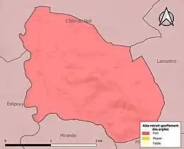 Le retrait-gonflement des sols argileux est susceptible d'engendrer des dommages importants aux bâtiments en cas d’alternance de périodes de sécheresse et de pluie. La totalité de la commune est en aléa moyen ou fort (94,5 % au niveau départemental et 48,5 % au niveau national). Sur les 45 bâtiments dénombrés sur la commune en 2019, 45 sont en aléa moyen ou fort, soit 100 %, à comparer aux 93 % au niveau départemental et 54 % au niveau national. Une cartographie de l'exposition du territoire national au retrait gonflement des sols argileux est disponible sur le site du BRGM[22],[Carte 3].