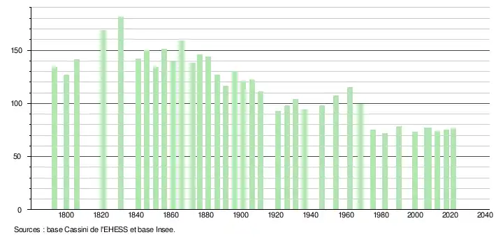 L'évolution du nombre d'habitants est connue à travers les recensements de la population effectués dans la commune depuis 1793. Pour les communes de moins de 10 000 habitants, une enquête de recensement portant sur toute la population est réalisée tous les cinq ans, les populations légales des années intermédiaires étant quant à elles estimées par interpolation ou extrapolation[25]. Pour la commune, le premier recensement exhaustif entrant dans le cadre du nouveau dispositif a été réalisé en 2007[26].