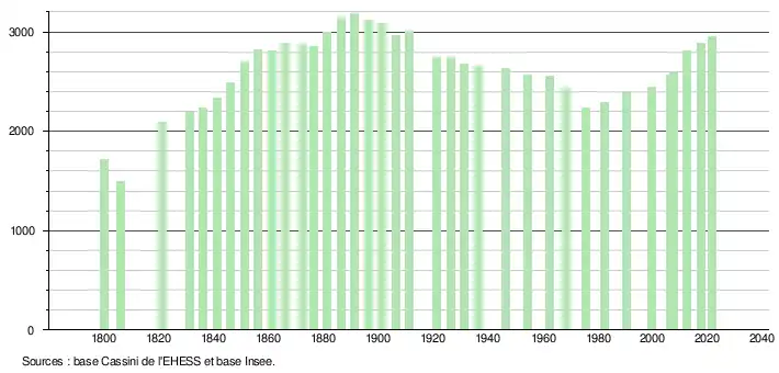L'évolution du nombre d'habitants est connue à travers les recensements de la population effectués dans la commune depuis 1800. Pour les communes de moins de 10 000 habitants, une enquête de recensement portant sur toute la population est réalisée tous les cinq ans, les populations légales des années intermédiaires étant quant à elles estimées par interpolation ou extrapolation[22]. Pour la commune, le premier recensement exhaustif entrant dans le cadre du nouveau dispositif a été réalisé en 2007[23].