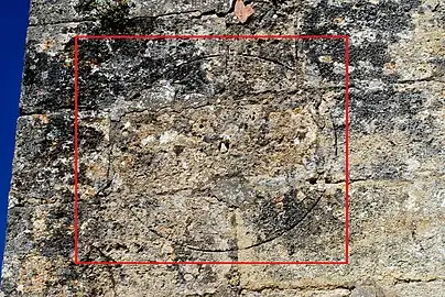 - Un des cadrans est sur une pierre de remploi ; l'artisan qui a réutilisé la pierre l'a posée avec le cadran canonial inversé.