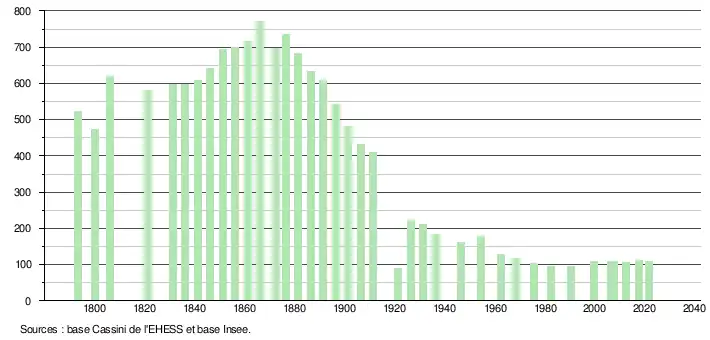 L'évolution du nombre d'habitants est connue à travers les recensements de la population effectués dans la commune depuis 1793. Pour les communes de moins de 10 000 habitants, une enquête de recensement portant sur toute la population est réalisée tous les cinq ans, les populations légales des années intermédiaires étant quant à elles estimées par interpolation ou extrapolation[18]. Pour la commune, le premier recensement exhaustif entrant dans le cadre du nouveau dispositif a été réalisé en 2007[19].