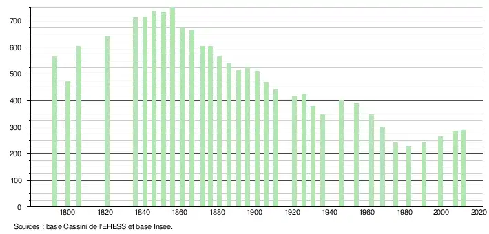 L'évolution du nombre d'habitants est connue à travers les recensements de la population effectués dans la commune depuis 1793. À partir du , les populations légales des communes sont publiées annuellement dans le cadre d'un recensement qui repose désormais sur une collecte d'information annuelle, concernant successivement tous les territoires communaux au cours d'une période de cinq ans. Pour les communes de moins de 10 000 habitants, une enquête de recensement portant sur toute la population est réalisée tous les cinq ans, les populations légales des années intermédiaires étant quant à elles estimées par interpolation ou extrapolation[9]. Pour la commune, le premier recensement exhaustif entrant dans le cadre du nouveau dispositif a été réalisé en 2007[10],[Note 2].