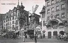 Il y eut jusqu’à 30 moulins à vent sur la butte Montmartre (dont 12 rue Lepic) qui broyaient du grain, du maïs, du plâtre, de la pierre. Étymologiquement, on oppose à « cabaret » ou « cabret » (terme d’origine picarde, signifiant « petite chambre » ou « établissement où l’on sert des boissons »), ce que Jean Deny appelle le prototype arabe kharabat (« خربات »)[10] signifiant « cabaret » en turc[11], persan[12] et pachto[13], ou encore khammarât « خمارات »[14], autre racine arabe proposée par Antoine-Paulin Pihan. La revue est à l’époque une petite pièce comique ou satirique passant en revue l’actualité et ses personnalités, avec humour et irrévérence.