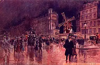 Le Moulin-Rouge affiche « Bal, divertissements, variétés » ; Henri de Toulouse-Lautrec fête ses 25 ans, il est dans la salle. Visionnaires, Joseph Oller, créateur propriétaire, et Charles Zidler, directeur, imaginent un lieu rehaussé d’un gros moulin peint en rouge et illuminé la nuit afin d’être bien visible depuis les Grands boulevards et le bas de la rue Blanche. Le Moulin-Rouge, très différent des autres moulins de la butte Montmartre avait pour vocation essentielle d'être l'enseigne de l'établissement. Dessiné par Adolphe Willette, il fut le premier bâtiment électrifié de Paris. Sa forme et sa couleur immédiatement reconnaissables en ont fait un des emblèmes de Paris.