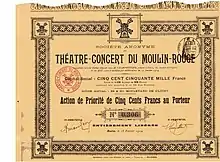 Le Moulin-Rouge[n 1] est un cabaret parisien fondé en 1889 par le Catalan Josep Oller et par Charles Zidler, qui possédaient déjà l'Olympia. Il est situé sur le boulevard de Clichy dans le 18e arrondissement de Paris, dans le quartier Pigalle au pied de la butte Montmartre[5].
