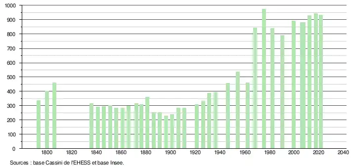 L'évolution du nombre d'habitants est connue à travers les recensements de la population effectués dans la commune depuis 1793. Pour les communes de moins de 10 000 habitants, une enquête de recensement portant sur toute la population est réalisée tous les cinq ans, les populations légales des années intermédiaires étant quant à elles estimées par interpolation ou extrapolation[23]. Pour la commune, le premier recensement exhaustif entrant dans le cadre du nouveau dispositif a été réalisé en 2007[24].