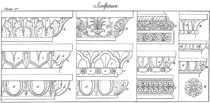 - K : Cavet avec filet et baguette, sur lesquels sont taillés des feuilles d'eau et un chapelet à perle. 26. Feuille d'eau. 27. Perle.