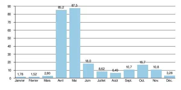 Le débit moyen mensuel observé en février (minimum d'étiage) est de 1,52 m3/s, soit plus ou moins 2 % du débit moyen du mois de mai (87,5 m3/s), ce qui témoigne de variations saisonnières très élevées. Sur la durée d'observation de 62 ans, le débit mensuel minimal a été de 0,27 m3/s en , tandis que le débit mensuel maximal atteignait 233 m3/s en .