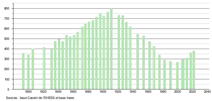 L'évolution du nombre d'habitants est connue à travers les recensements de la population effectués dans la commune depuis 1793. Pour les communes de moins de 10 000 habitants, une enquête de recensement portant sur toute la population est réalisée tous les cinq ans, les populations légales des années intermédiaires étant quant à elles estimées par interpolation ou extrapolation[27]. Pour la commune, le premier recensement exhaustif entrant dans le cadre du nouveau dispositif a été réalisé en 2007[28].