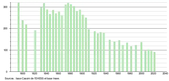 L'évolution du nombre d'habitants est connue à travers les recensements de la population effectués dans la commune depuis 1793. Pour les communes de moins de 10 000 habitants, une enquête de recensement portant sur toute la population est réalisée tous les cinq ans, les populations légales des années intermédiaires étant quant à elles estimées par interpolation ou extrapolation[14]. Pour la commune, le premier recensement exhaustif entrant dans le cadre du nouveau dispositif a été réalisé en 2006[15].