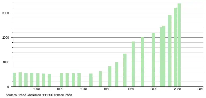 L'évolution du nombre d'habitants est connue à travers les recensements de la population effectués dans la commune depuis 1881. Pour les communes de moins de 10 000 habitants, une enquête de recensement portant sur toute la population est réalisée tous les cinq ans, les populations légales des années intermédiaires étant quant à elles estimées par interpolation ou extrapolation[22]. Pour la commune, le premier recensement exhaustif entrant dans le cadre du nouveau dispositif a été réalisé en 2008[23].
