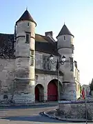 À l'angle des deux ailes, il possède une porterie flanquée de deux tourelles rondes de trois étages, coiffées de toits en poivrière. Le rez-de-chaussée comporte une porte piétonne et une porte charretière, et le mur au-dessus est recouvert par un chaperon. Le mur de l'étage en léger recul présente une grande fenêtre à meneaux.