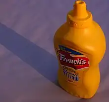 - Moutarde jaune. C'est la moutarde la plus communément utilisée en Amérique du Nord. Cette moutarde nord-américaine est également vendue sous le nom de « moutarde préparée » et elle est aussi communément appelée « moutarde à hot-dog » ou « moutarde baseball »[3] par les francophones d'Amérique. Elle aurait été introduite en 1904 par George J. French sous le nom de Cream salad mustard, ce qui signifie « sauce de salade à la moutarde ». En Amérique du Nord, la moutarde jaune n'est pas seulement utilisée pour garnir les hot-dogs, mais également les sandwichs, les bretzels, les hamburgers, le saucisson de Bologne, etc. C'est aussi un ingrédient de nombreuses salades de pommes de terre, de sauces barbecue et de vinaigrettes.