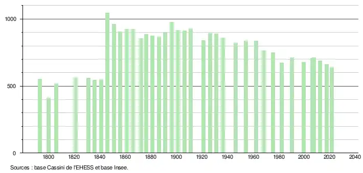 L'évolution du nombre d'habitants est connue à travers les recensements de la population effectués dans la commune depuis 1793. Pour les communes de moins de 10 000 habitants, une enquête de recensement portant sur toute la population est réalisée tous les cinq ans, les populations légales des années intermédiaires étant quant à elles estimées par interpolation ou extrapolation[28]. Pour la commune, le premier recensement exhaustif entrant dans le cadre du nouveau dispositif a été réalisé en 2007[29].