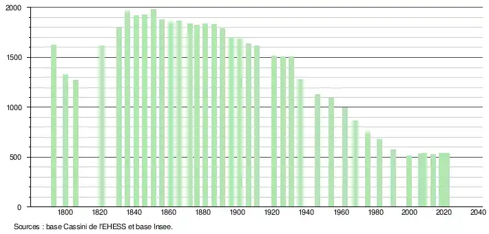 L'évolution du nombre d'habitants est connue à travers les recensements de la population effectués dans la commune depuis 1793. Pour les communes de moins de 10 000 habitants, une enquête de recensement portant sur toute la population est réalisée tous les cinq ans, les populations légales des années intermédiaires étant quant à elles estimées par interpolation ou extrapolation[24]. Pour la commune, le premier recensement exhaustif entrant dans le cadre du nouveau dispositif a été réalisé en 2008[25].