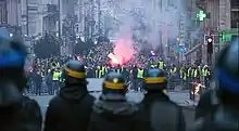 Lors de l'« acte II », sur l'avenue des Champs-Élysées, à Paris, des barricades sont montées puis incendiées, des abribus cassés et des vitrines de commerces brisées[97]. Le samedi suivant, des casseurs vandalisent l'arc de triomphe de l'Étoile[98],[99], tandis qu'une partie de la préfecture du Puy-en-Velay est incendiée[100]. La situation se calme durant l'« acte IV », avec en particulier des Gilets jaunes s'opposant à des casseurs[101],[102]. Lors de l'« acte VIII », la destruction avec un engin de chantier de la porte de la cour de l'hôtel de Rothelin-Charolais conduit à l’évacuation du secrétaire d’État et porte-parole du gouvernement, Benjamin Griveaux[103],[104].