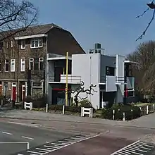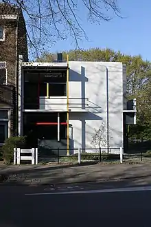 Pour Theo van Doesburg, la maison Schröder conçue par Gerrit Rietveld, le seul architecte du groupe de Stijl en 1923-1924, est la seule réalisation utilisant les principes tirés de son manifeste : À une architecture nouvelle publié dans la revue de Stijl. La nouvelle architecture brise le mur et détruit la séparation intérieure / extérieure avec des murs non porteurs ce qui crée un plan ouvert avec des espaces intérieurs et extérieurs se pénétrant les uns les autres. À l'étage de la maison, Gerrit Rietveld utilise des parois coulissantes à la place des murs fixes. La nouvelle architecture n'enferme pas les fonctions dans des cubes, les façades ne sont plus rigides ni statiques mais offrent une richesse plastique d'effets spéciaux. La nouvelle architecture est anti-décorative et la couleur est une expression organique de la couleur. Gerrit Rietveld conçoit ses œuvres comme des sculptures et dépasse les principes de Theo van Doesburg en donnant à l'écran une portée beaucoup plus large et en déplaçant le porte-à-faux au niveau de l'ossature elle-même[29],[33],[34],[27].