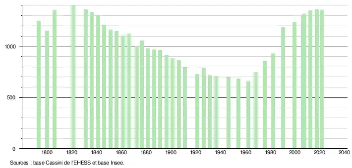L'évolution du nombre d'habitants est connue à travers les recensements de la population effectués dans la commune depuis 1793. Pour les communes de moins de 10 000 habitants, une enquête de recensement portant sur toute la population est réalisée tous les cinq ans, les populations légales des années intermédiaires étant quant à elles estimées par interpolation ou extrapolation[22]. Pour la commune, le premier recensement exhaustif entrant dans le cadre du nouveau dispositif a été réalisé en 2007[23].