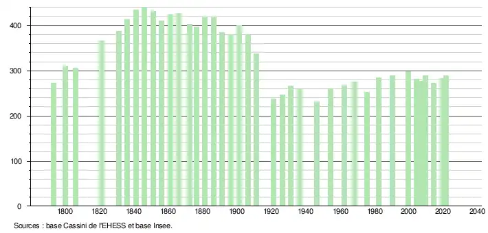 L'évolution du nombre d'habitants est connue à travers les recensements de la population effectués dans la commune depuis 1793. Pour les communes de moins de 10 000 habitants, une enquête de recensement portant sur toute la population est réalisée tous les cinq ans, les populations légales des années intermédiaires étant quant à elles estimées par interpolation ou extrapolation[25]. Pour la commune, le premier recensement exhaustif entrant dans le cadre du nouveau dispositif a été réalisé en 2004[26].