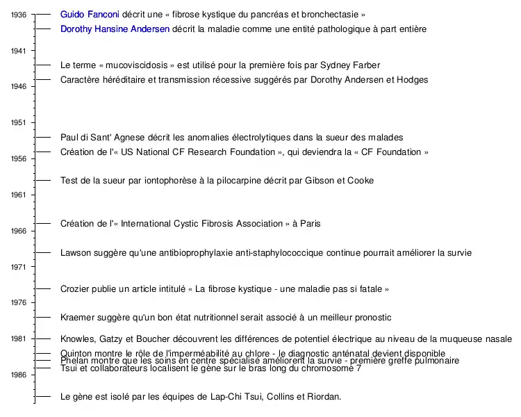 Connue depuis le Moyen Âge, la maladie est décrite scientifiquement par le pédiatre suisse Guido Fanconi en 1936[11]. Elle est identifiée deux ans plus tard par Dorothy Hansine Andersen comme une entité pathologique atteignant le pancréas d'où son nom historique de fibrose kystique du pancréas. Elle conserve ce nom en anglais : cystic fibrosis.