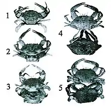 Série de photos des différentes phases de l'exuviation du crabe bleu.