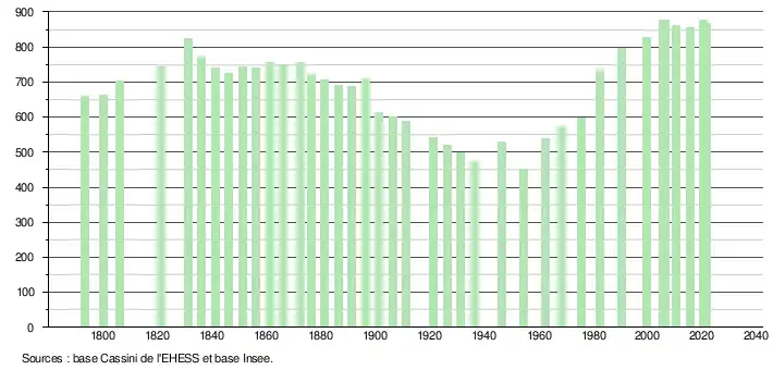 | L'évolution du nombre d'habitants est connue à travers les recensements de la population effectués dans la commune depuis 1793. Pour les communes de moins de 10 000 habitants, une enquête de recensement portant sur toute la population est réalisée tous les cinq ans, les populations légales des années intermédiaires étant quant à elles estimées par interpolation ou extrapolation[26]. Pour la commune, le premier recensement exhaustif entrant dans le cadre du nouveau dispositif a été réalisé en 2005[27]. En 2021, la commune comptait 866 habitants[Note 4], en augmentation de 1,29 % par rapport à 2015 (Eure : −0,5 %, France hors Mayotte : +1,84 %). |