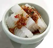 | Variétés de muk de pois verts : cheongpo muk et hwangpo muk[3] | 청포묵, 황포묵 | Suspension de pois moulus, tamisés, bouillis et coupés[4] |
