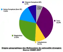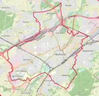 Mulhouse (/myluz/), en alsacien, Milhüsa ([mɪlˈhyːsɐ]), en allemand, Mülhausen, est une commune française située dans la collectivité européenne d'Alsace. Elle est la première commune du Haut-Rhin en nombre d'habitants, la deuxième d'Alsace (après Strasbourg) et la quatrième[1] agglomération[2] du Grand Est[3]. 56 %[4] des habitants de l'agglomération résident dans sa banlieue, provoquant une importante et croissante mobilité pendulaire. Son aire d'attraction[5] couvre 410 254 habitants[6],[7](53 % de la population du Haut-Rhin[8]) et sa zone d'emploi regroupe 431 337 habitants[9].