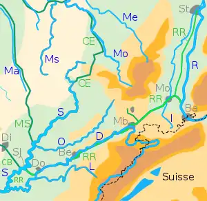 La ville, située dans le sud de la plaine d'Alsace, se trouve à 30 km de la Suisse, 14 km de l'Allemagne et 20 km du massif vosgien. Mulhouse est traversée par deux cours d'eau, la Doller et l'Ill, affluents du Rhin. L'Ill traverse l'Alsace du nord au sud et a donné son nom à la région. La Doller se jette dans l'Ill au niveau de Mulhouse. À Mulhouse, l'Ill se divise en deux, une partie emprunte le canal de décharge de l'Ill et l'autre emprunte l'ancien lit à travers un réseau souterrain de rivières[37]. C'est sur les rives de ce bras que la ville s'est construite, il emprunte en souterrain les anciennes douves de la ville avant d'alimenter le Nouveau Bassin. Une partie de la Doller est déviée et traverse également la ville en souterrain grâce à un canal appelé le Steinbaechlein[38], qui lui-même se divise en deux autres canaux souterrains : un qui rejoint la Doller et l'autre qui traverse le centre-ville. Ce dernier se divise à nouveau en deux bras souterrains : un qui rejoint le Nouveau Bassin et un autre qui rejoint le canal de décharge de l'Ill[39].