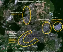 Mulhouse est la deuxième ville d'Alsace, qui est la troisième région la plus densément peuplée[41] de France métropolitaine après l'Île-de-France et le Nord-Pas-de-Calais. La ville exerce une attractivité sur tout le Sud-Alsace. Cette zone d'attractivité est limitrophe, à l'ouest, de deux pôles de moindre importance qui lui sont contigus : l'aire urbaine de Guebwiller et l'aire urbaine de Thann-Cernay. Le triangle composé par les aires urbaines de Mulhouse, Guebwiller et Thann-Cernay est très fortement lié aussi bien par une forte proximité géographique que par une histoire commune liée à l'industrie. Au sud s'étend l'Aire urbaine de Bâle - Saint-Louis. L'agglomération de Bâle est un des pôles majeurs du Rhin supérieur et aussi le plus méridional. Également très liés économiquement et historiquement, Mulhouse et Bâle ont choisi de créer un aéroport binational commun, l'EuroAirport inauguré le , par où transitent annuellement près de 7 millions de passagers.